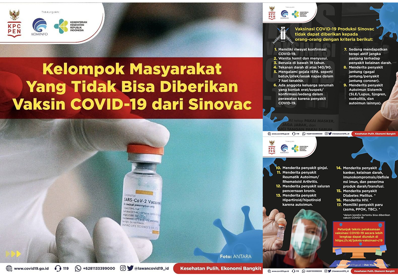 Siapa saja yang tidak boleh divaksin Covid-19 dari Sinovac ? Simak Info Berikut !17 Januari 2021Pelaksanaan Vaksinasi COVID-19 di Indonesia sudah dimulai pada 13 Januari 2021. Saat ini pelaksanaanya mengunakan vaksin COVID-19 produksi Sinovac dan diprioritaskan untuk tenaga kesehatan serta petug ... |