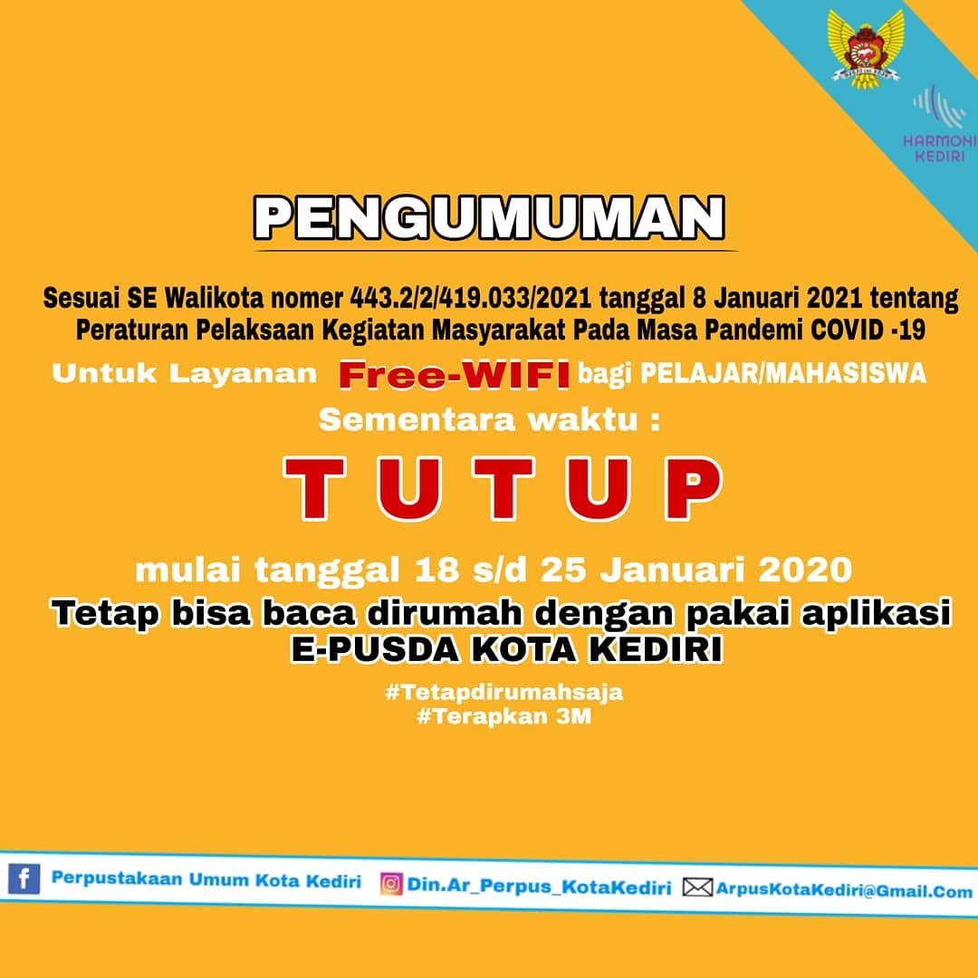 Layanan Wifi Gratis Perpustakaan Umum Kota Tutup Sementara19 Januari 2021Pengumuman Bagi pengguna layanan Free Wifi perpustakaan umum Daerah Kota Kediri sementara TUTUP mukai tanggal 18 s/d 25 Januari 2021. Oh ya Ndaaa...!!! Untuk Pelayanan Baca dan Pinjam Buku sementara T ... |