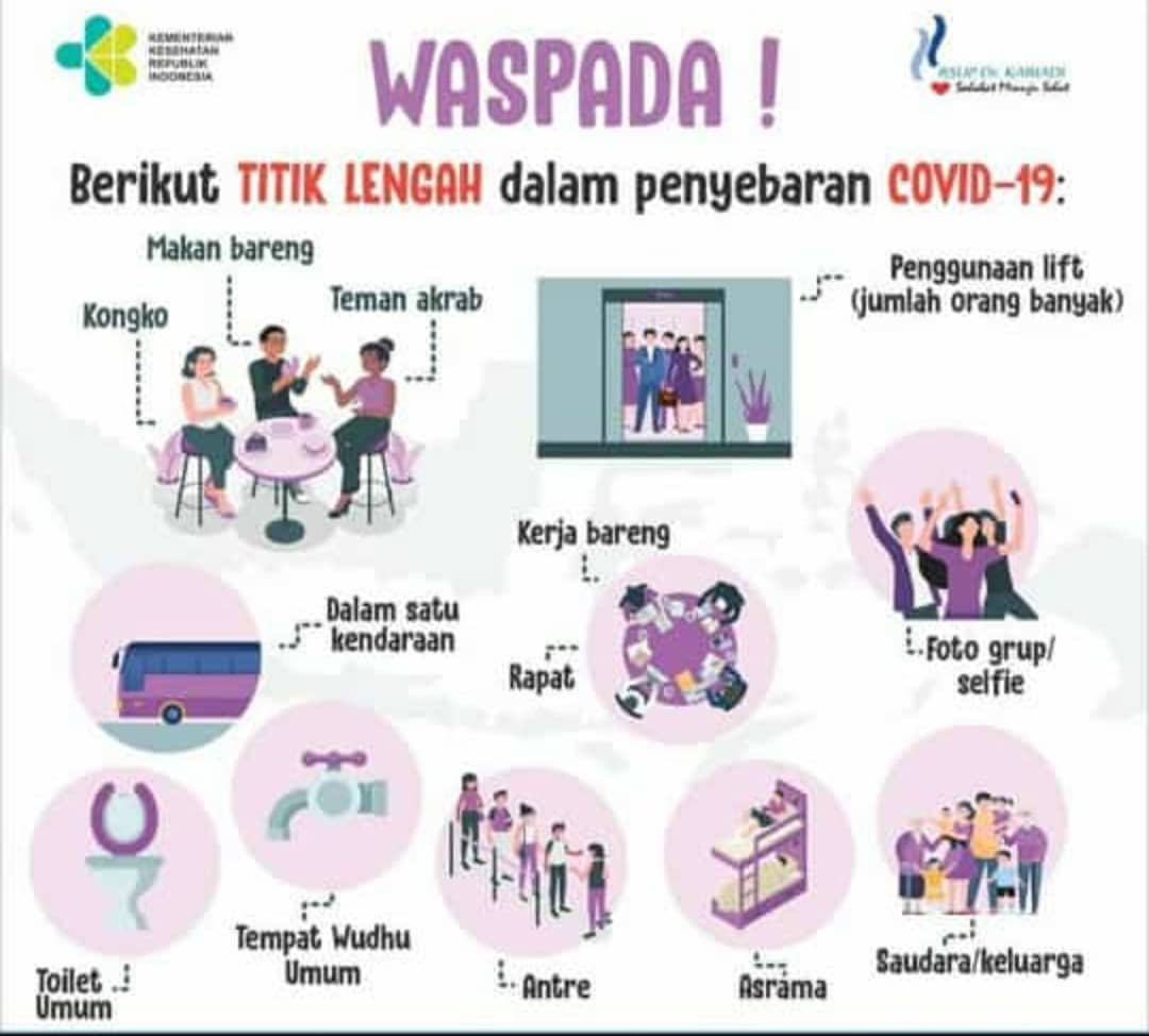 Waspada Titik Lengah Dalam Penyebaran Covid-1920 Januari 2021Saat ini kita masih berada di situasi pandemi. Selalu waspada bahkan meningkatkan kewaspadaan sangat penting untuk dilakukan. Berikut ini adalah beberapa titik lengah penyebaran Covid-19 yang sering k ... |